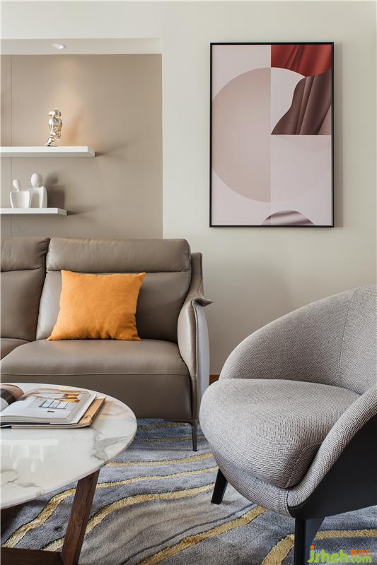 我們希望家的氛圍是柔和安寧的,于是用了淺灰墻板做了沙發(fā)背景,利用承重柱與墻體的厚度差做出了陳列區(qū),藝術(shù)品在這個空間里完全服務(wù)于生活,灰紫的畫呼應(yīng)了隔板上的美麗盆栽。室內(nèi)設(shè)計師不同于藝術(shù)家只專注于創(chuàng)作,還應(yīng)該做好項目的執(zhí)行管理。藝術(shù)品應(yīng)該是生活的元素。