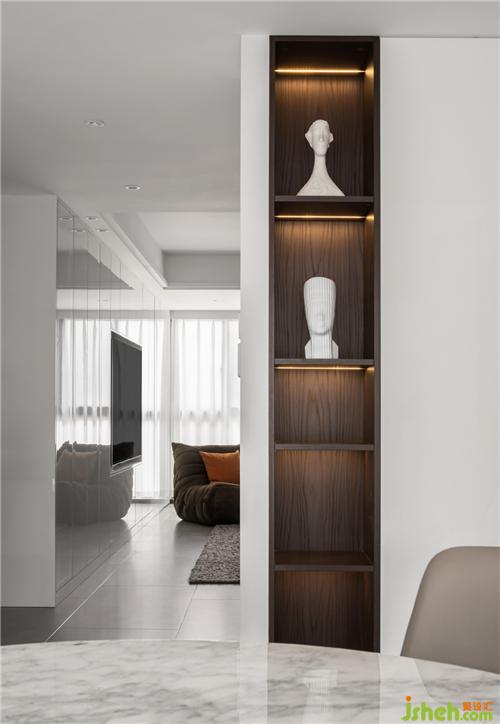 胡桃色KD板處理的造型部分,其實是擴展出的原陽臺??臻g得到了延展,隱藏了結構柱。藝術壁燈閃耀全場。