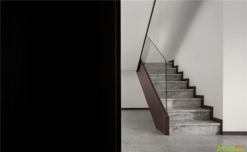 反過來從客廳向餐廳透視亦然,樓梯的雕塑感是讓設計師最為得意之筆,雖然幾經(jīng)周折,但最終落地仍然趨于完美。