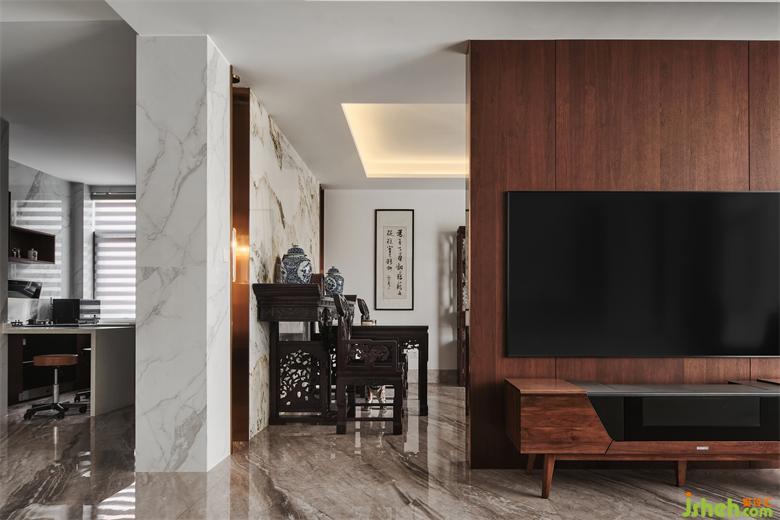 由胡桃木電視墻隔斷出來(lái)的后面空間