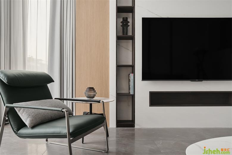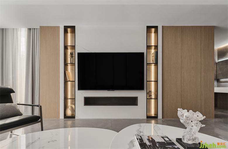 主題電視墻面設(shè)計(jì)出兩列細(xì)長(zhǎng)的裝飾架
