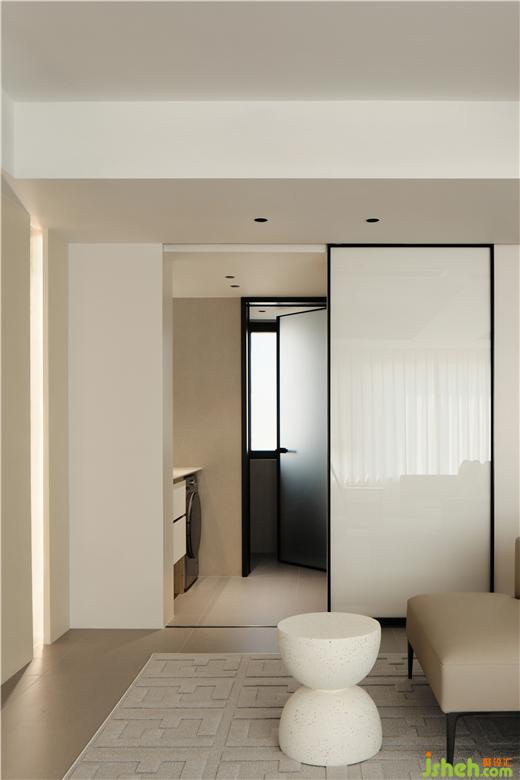The porch, kitchen and guest bathroom are arranged in a word, and the glass sliding door with very narrow frame realizes the opening and closing conversion of space. The sliding door track shall be embedded in the ceiling to make sure the space is neat and clean. A small washing machine is placed in the washroom of the guest bathroom, and a top mounted washing and nursing articles display cabinet is on the opposite wall of the basin. Clean and tidy living space comes from adequate and reasonable storage.