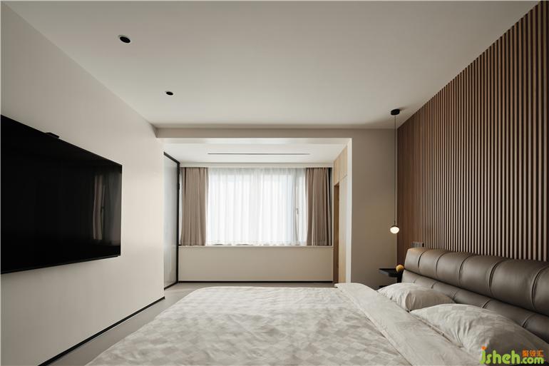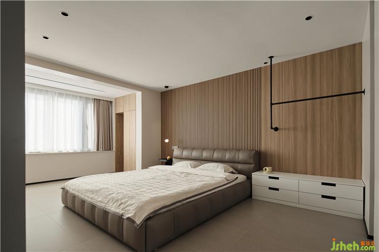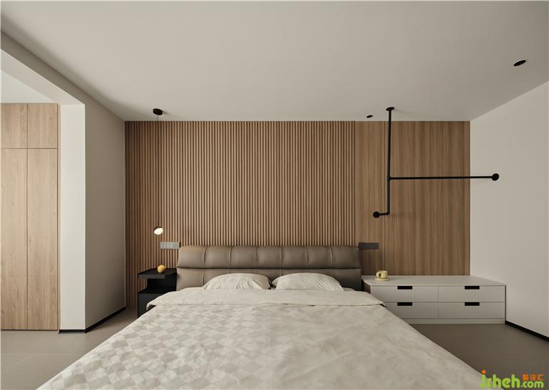 The original balcony on the second floor is open, allowing the master bedroom to directly reach the sun, which opens the space and broadens the mood. The bed background of the wood grid carves out the delicate side of the space. Customized black paint art support above the bedside long cabinet, with both functions and aesthetics.