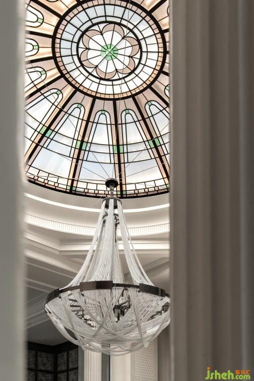 售樓處設(shè)計(jì)汲取美琪大劇院穹頂元素,復(fù)合和平飯店吊頂形式,疊現(xiàn)法式結(jié)構(gòu)的規(guī)則之美;979塊彩色藝術(shù)玻璃鑲嵌凝一,致敬上?!笆镅髨?chǎng)”的繁華綺夢(mèng)。室內(nèi)的立柱與天花的穹頂保持一定的自序及節(jié)奏感,結(jié)合吊燈加強(qiáng)空間的儀式感。