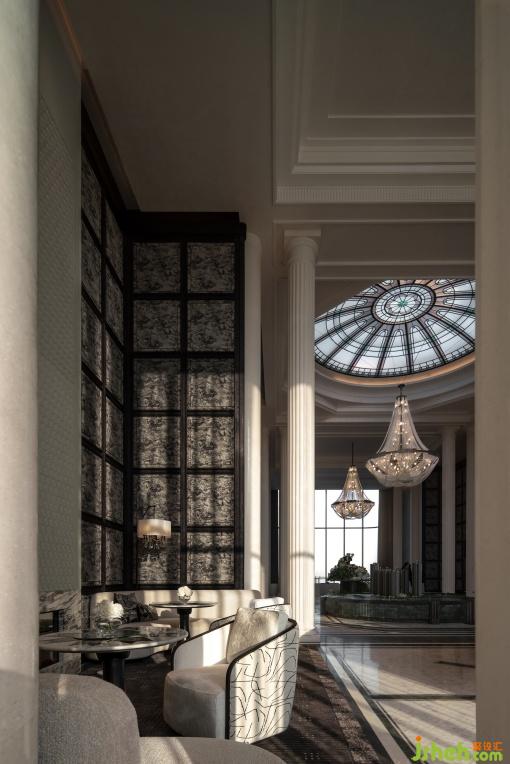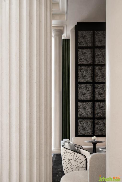 中心水吧區(qū)借鑒法式建筑的感受,逾兩萬六千朵山茶花雕刻圖案,鋪陳詩意浪漫的夢(mèng)幻篇章。土耳其石材自然清雅的質(zhì)地,罩染上一層寧靜、雅致而明澈的底色。陶立克柱式,含蓄地將法式古建美感引入場(chǎng)內(nèi),結(jié)合現(xiàn)代設(shè)計(jì)營造,促成感受的共相,讓人同環(huán)境產(chǎn)生微妙共振。