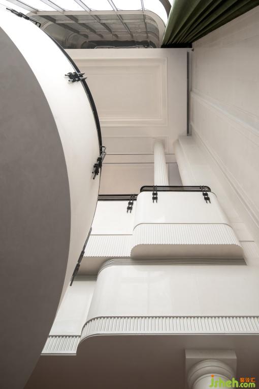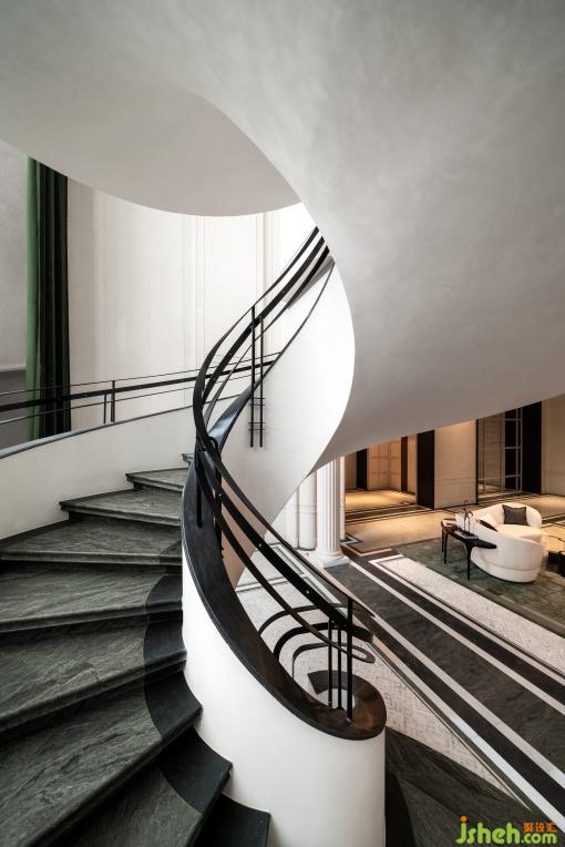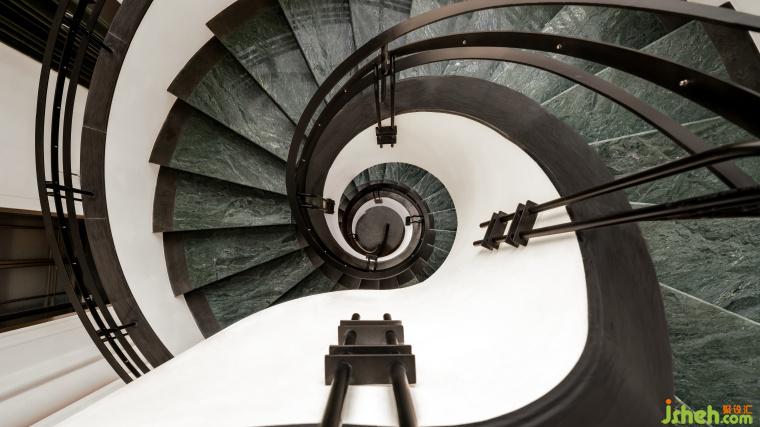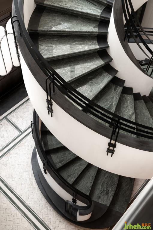 樓梯,既是建筑這個美人的腹“臍”,亦是貫連不同樓層的“軸”——在某個敏感的視覺“焦點”,由一根根似軟實硬的鐵質(zhì)扶手優(yōu)雅地隨梯級走勢勾勒古典同逸趣交融匯歸。