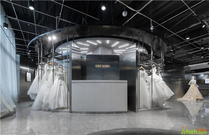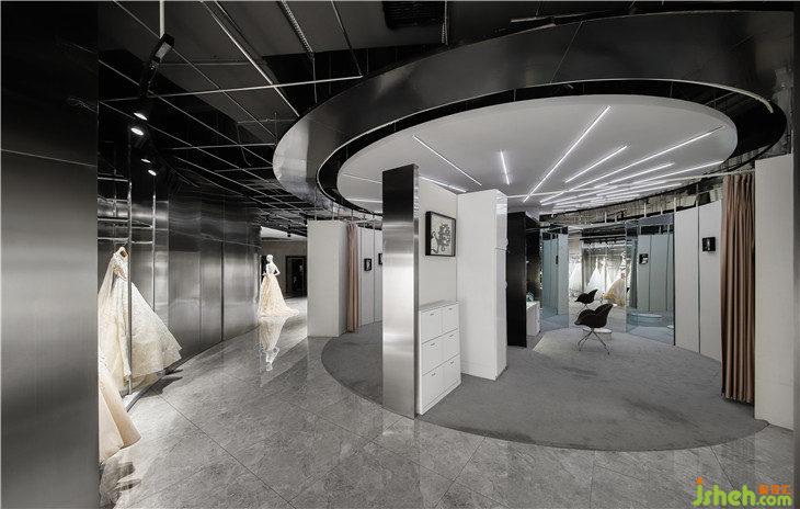 背景墻、陳列架、沙發(fā)、地板、地毯……皆用不同飽和度的灰色,形成豐富的層次感,讓空間中的主體——婚紗,得到視覺上最大限度的效果凸顯。