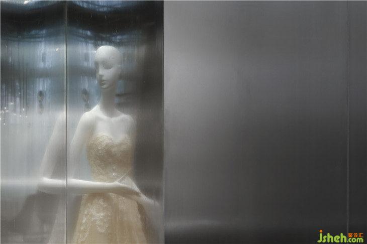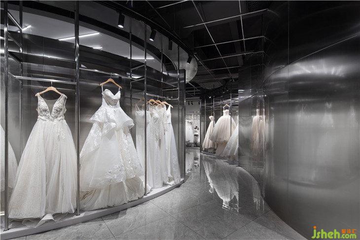 空間運用大量磨砂不銹鋼材質(zhì),以虛實手法大面積鋪設了主體背景墻。不銹鋼材質(zhì)本身的色澤和光感展現(xiàn)出了強烈的包容感,由于不同角度的光源照射以及光源本身的變化,映照在背景墻上的婚紗形狀與色調(diào)也會產(chǎn)生相應變化,令人感覺如夢似幻。