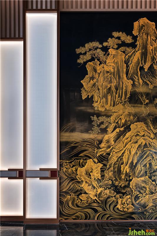 屏風(fēng)選取故宮藏品《秋山行旅圖》中峰巒疊嶂與松的結(jié)合再創(chuàng)作,使用“堆漆+描金”的工藝手法,將古典藝術(shù)的感染力融入沈陽的生命力。用漆灰堆起花紋后髹涂黑漆,打磨達到光亮后,用斗透明漆調(diào)和的彩漆在漆器面上薄描花紋,放入溫室待漆即將干燥時,著最細的金粉刷在花紋上。