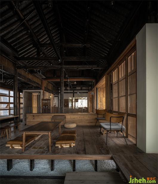 用餐區(qū)中央整體被抬高,形成頗具日式風(fēng)格的榻榻米區(qū),文集設(shè)計(jì)帶有多格書架的實(shí)木吧臺(tái)、水吧及下沉式休閑區(qū)域,讓室內(nèi)空間錯(cuò)落有致,形成一個(gè)有趣的視覺(jué)體系。鄰窗水流聲不絕于耳,樹影婆娑,內(nèi)院景色一覽無(wú)余。