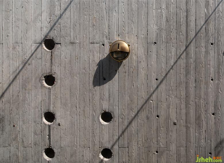 The transformedbackyard has uniqueinterest and charm; the Zen of Japanese rock garden creates anindifferent andtranquil atmosphere. The new concrete wall andstaircase linked up tothe original gable are naked and cold. As oneascends the stairs,sunlight comes inthrough round holes, which brings out the greatest beauty of light and shadow.