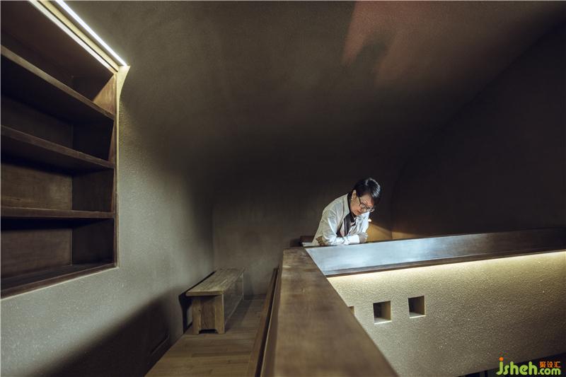 而整體分氛圍更是立求營造出寧靜、舒緩的狀態(tài)。這不僅得益于整體色調(diào)的營造,光與空間的關(guān)系也是有效的手段,且是最為重要的手段。外部光線通過天窗的空洞灑進室內(nèi),并隨著時間的變化而游走,產(chǎn)生有趣的變化。室內(nèi)燈光的營造也極為講究,我們甚至沒有在大環(huán)境中用到一顆筒射燈,所有的燈光都與建筑形態(tài)進行了結(jié)合,自然而然的生長出來,猶如夾縫中的一道天光一般。同時壁爐所產(chǎn)生的火光又與整個空間產(chǎn)生這著微妙的關(guān)系與融合?;鸺t的光影忽大忽小,閃爍的紅色映射與冰冷的墻壁產(chǎn)生著對話。這更像是建筑空間里的呼吸,給了修行者生機與希望。