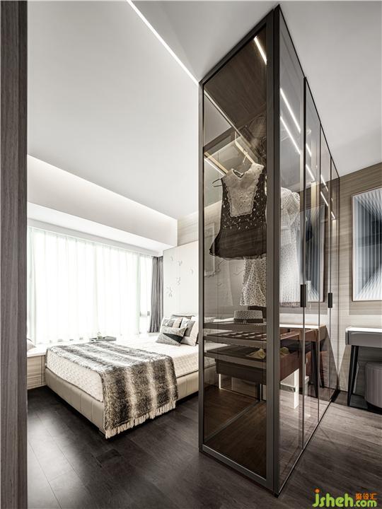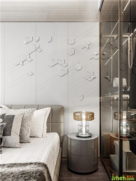 主臥背景以手工皮雕打造,與定制玻璃高柜完美結(jié)合,盡顯都市時(shí)尚感。