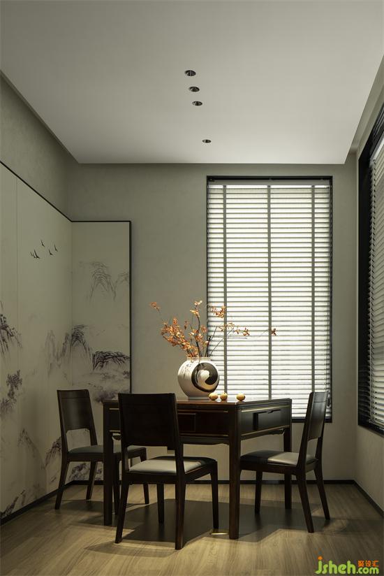 棋牌室的設(shè)計(jì)深諳居住者的娛樂愛好和審美意趣在滿足功能需求的基礎(chǔ)上用詩意詮釋了別具一格的藝術(shù)品味中式風(fēng)格棋牌桌、山水畫屏風(fēng)一簇紅葉生于水墨之間為空間增加了奢雅、舒適、美學(xué)的專屬特性
