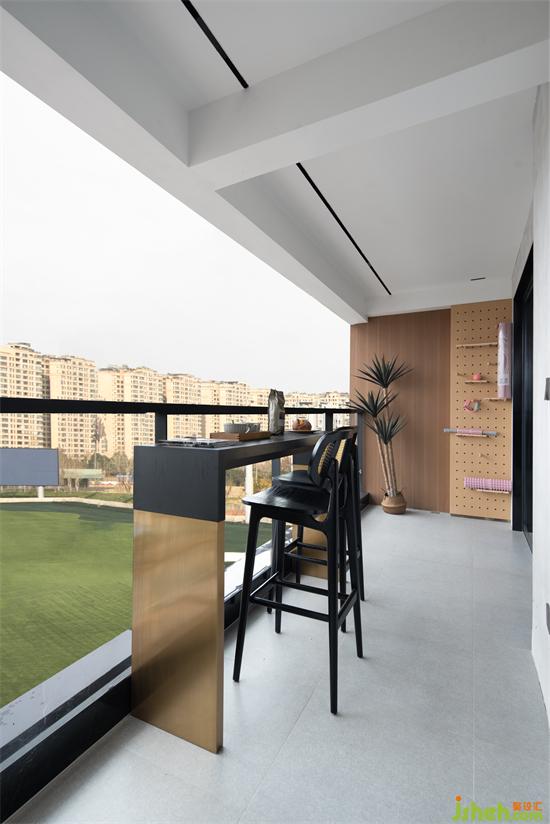 在陽臺布置簡約的吧臺、吧凳