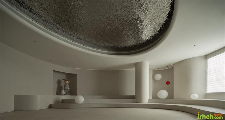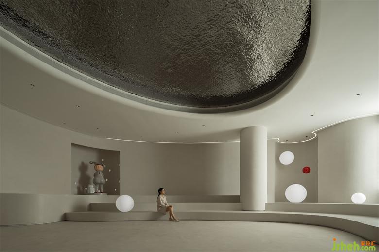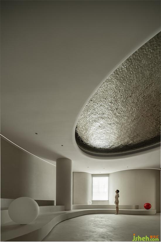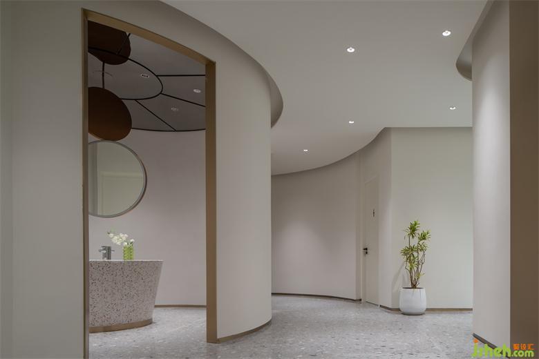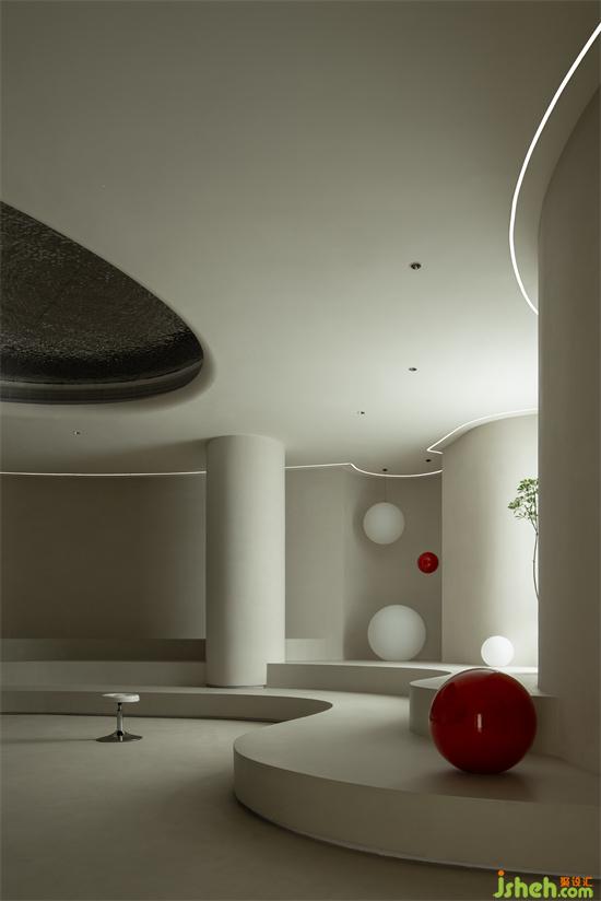 波浪、流水、水滴等自然意向的抽象提取,使空間不再呈現(xiàn)規(guī)矩平敘的樣子,純白色的空間以一種既含蓄又大膽的手法鋪敘開來(lái),頂面碩大的橢圓做二次造型,銀色的波紋鋼板嵌入其中,如涌動(dòng)的水面波光粼粼,星星點(diǎn)點(diǎn)的反光成為空間第一視覺焦點(diǎn);醫(yī)美旗艦店裝修設(shè)計(jì)地臺(tái)層層疊疊的曲線猶如小溪涓涓細(xì)流,放上一顆紅色球體,空間的藝術(shù)張力煥發(fā)而出,柔美、流動(dòng)、放松,是人與環(huán)境關(guān)系最好的調(diào)和。