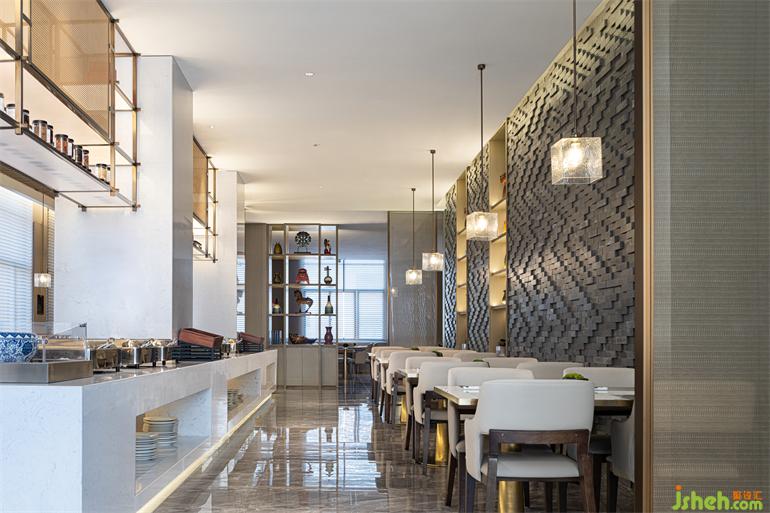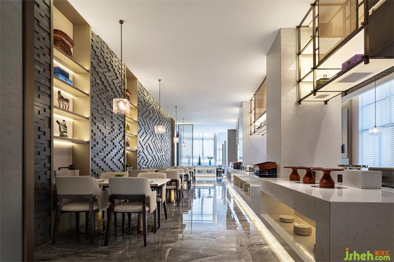 甫入前廳,便猶如踏進(jìn)回溯歷史的時(shí)光漫卷之中,夜郎古國的千載流光融入現(xiàn)代設(shè)計(jì)肌理,簡約利落的設(shè)計(jì)筆觸下滿含深意。酒店設(shè)計(jì)師將夜郎風(fēng)貌呈現(xiàn)于中央LED屏之上,將夜郎獸面紋糅合于隔斷與石柱之間,將詩仙太白“隨風(fēng)直到夜郎西”的愁心具象于燈火之中,在理石塑成的極簡建筑肌骨中賦活民族文化的精魂,讓古典元素與現(xiàn)代審美共生共榮。
