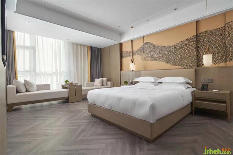 客房的硬裝設(shè)計(jì)延續(xù)了極簡與硬朗的風(fēng)格,多以溫潤的原木材質(zhì)鋪陳,在當(dāng)代與傳統(tǒng)之間找到了靈感的最佳契合點(diǎn)。標(biāo)準(zhǔn)大床房取意于龍泉淺灘的流沙之景,貴州觀山湖酒店設(shè)計(jì)將沙礫翻涌的畫面具象為巨幅壁畫,滿鋪在房間的床頭背景,在霎那間給旅客帶來心靈震撼的同時(shí),也將濃厚的貴州印象嵌入旅者的記憶,使自然意趣與人文精神實(shí)現(xiàn)貫通統(tǒng)一。