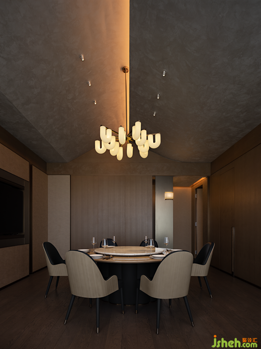 “銀箏夜”主題包間以古銀為主色調(diào),潮菜餐廳設(shè)計師將青銅器和銀的質(zhì)感相結(jié)合,為墻面與藝術(shù)燈具增添濃郁的金屬質(zhì)感氣息。 青銅器在古時被稱為"金"或"吉金",是崇高的禮器,亦是聲譽(yù)極盛的藝術(shù)寶藏。 泠泠銀箏通古意,錚錚余弦曉詩情。 設(shè)計師將銀與青銅融入空間,給予客人最頂級的禮遇與款待。The private room named "Silver Zither Night" revolves around the theme of ancient silver, with the designer artfully blending the textures of bronze and silver to imbue the walls and art lamps with a luxurious metallic ambiance. In ancient times, bronze was revered as a noble ceremonial weapon and an esteemed artistic treasure, known as "Jin" or "Jijin". The resonating melodies of the silver zither hold profound significance, and the poetic emotiveness lies within the harmonious vibrations of its strings. By integrating silver and bronze elements into the space, the designer bestows upon the guests the utmost level of courtesy and hospitality.