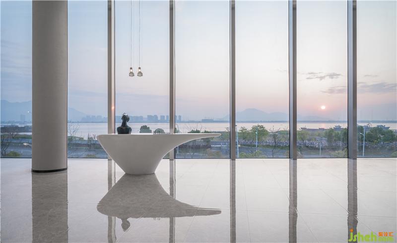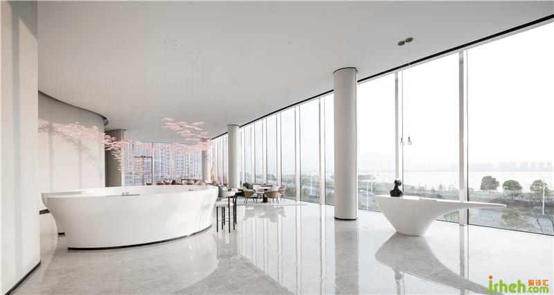 設(shè)計師以建筑自有的弧面形態(tài)和通透玻璃界面,將引景入室作為設(shè)計的切入點,以不動聲色之美學(xué),收納人杰地靈的自然之饋贈。售樓處設(shè)計