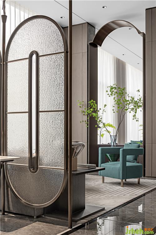 透過掩映的翠葉張望,洽談區(qū)里飛泉綠與高級灰錯落交織,愜意而不失高級感。磨砂玻璃的極簡屏風(fēng)作為隔斷對稱陳列,通透之余也強化了簡潔的秩序力度。