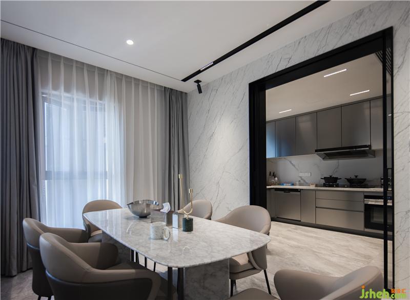 餐廳與廚房半開放式一字排開,相互聯(lián)系,互不干擾?,F(xiàn)代拉絲金屬灰與質(zhì)感白在碰撞中融合,沒有夸張與炫目,而是平淡、溫馨,細(xì)膩地表達(dá)出對(duì)生活品質(zhì)的追求,用餐區(qū)也安靜地立在角落,共度這個(gè)短暫的柔軟時(shí)刻。