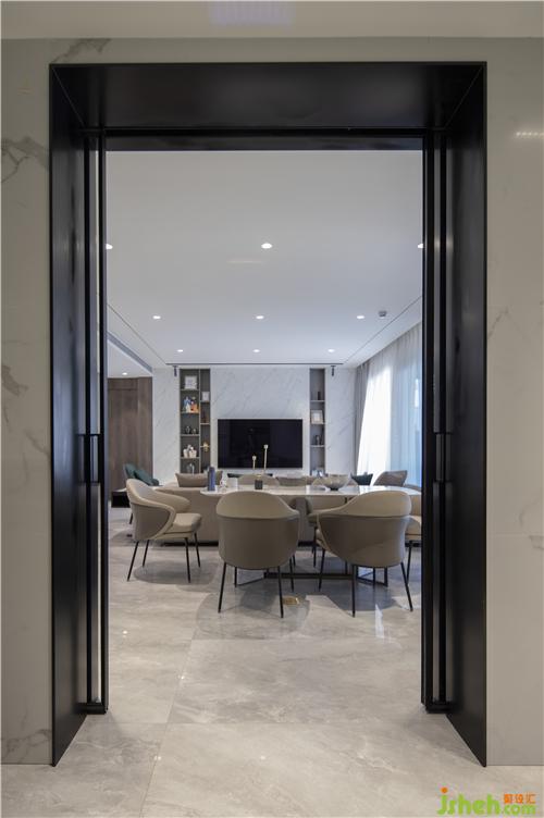 客廳開放式布局,將自然光照引入室內(nèi)??蛷d、餐廳、廚房、娛樂室相融合切換,實(shí)現(xiàn)與空間無縫銜接互動(dòng)。軟裝搭配融入時(shí)尚元素,提升現(xiàn)代感,營(yíng)造人文與環(huán)境和諧共處的空間體驗(yàn),拓展空間給予居者更開闊的視覺體驗(yàn)。