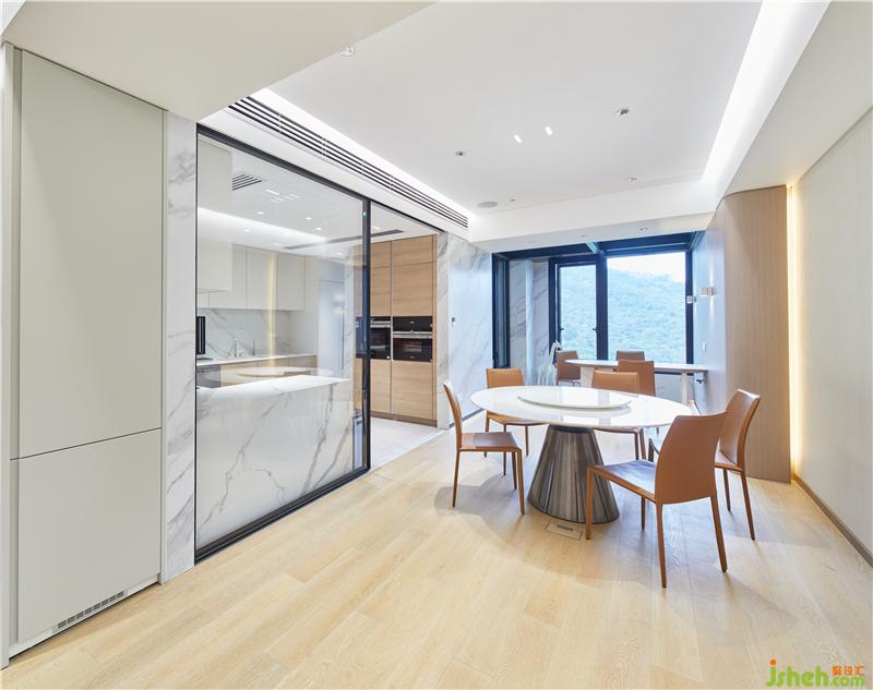 集匯設(shè)計將其廚房與餐廳貫穿通透、讓就餐空間更加現(xiàn)代和更開闊的視野用餐環(huán)境。深圳裝修設(shè)計山景相依,天然的材質(zhì)、休閑的屬性體現(xiàn)現(xiàn)代格調(diào)的高雅