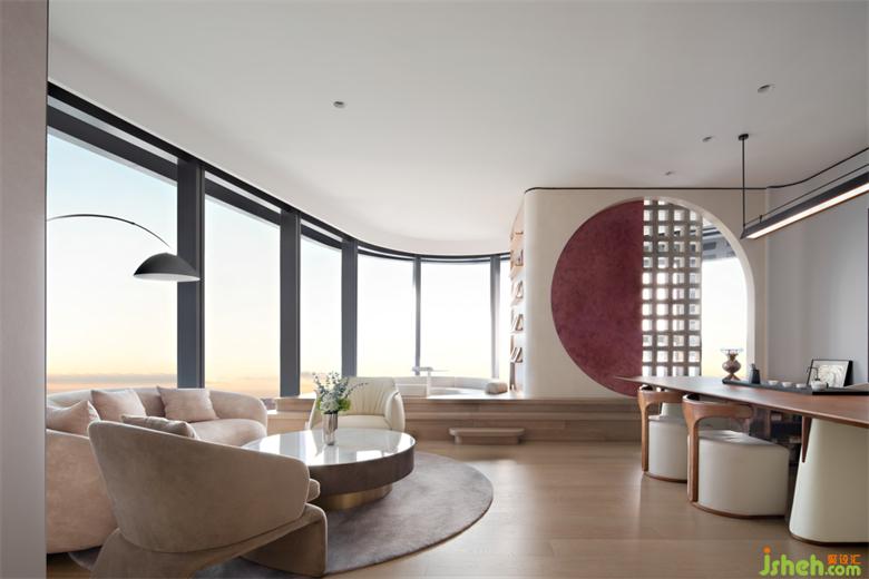 在空間的融合之間,感受東西方文化的微妙差異,一側(cè)是東方品茗歡言,一側(cè)則是現(xiàn)代簡約的情境體驗,珠寶展廳設(shè)計在闊景框窗的光影基調(diào)中營造優(yōu)雅的空間秩序,謙懷自然通感而生,滌蕩出靜謐的美學(xué)內(nèi)核。
