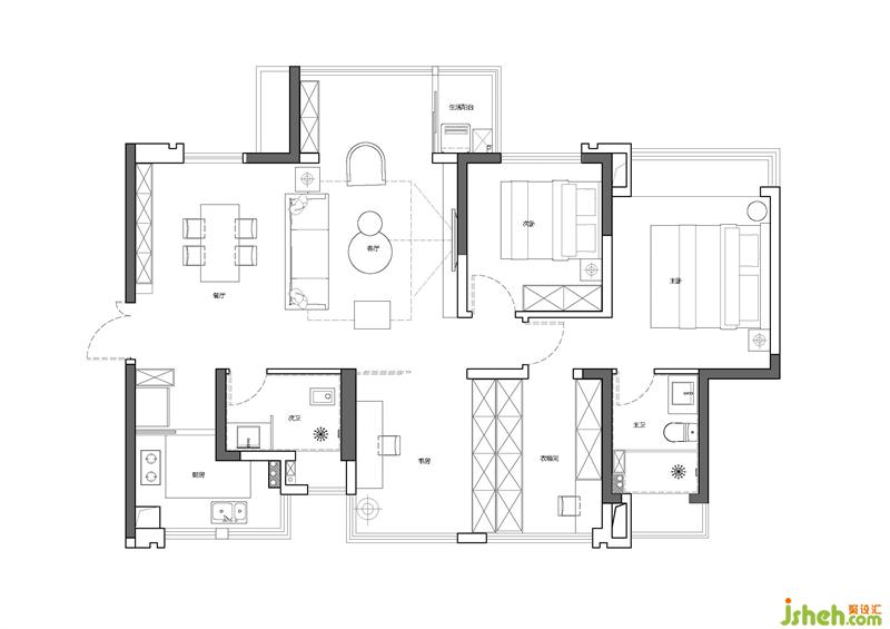 5.生活陽臺移入客廳陽臺原本凹進去位置,完善清潔功能;加上長虹玻璃門的設(shè)計又拓寬了電視墻的視野。
