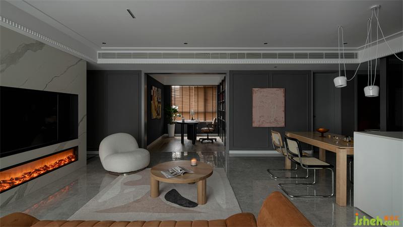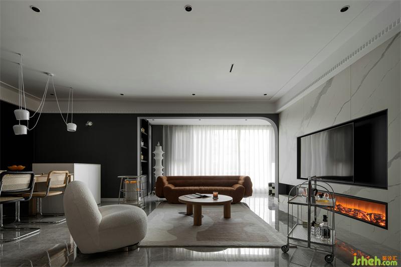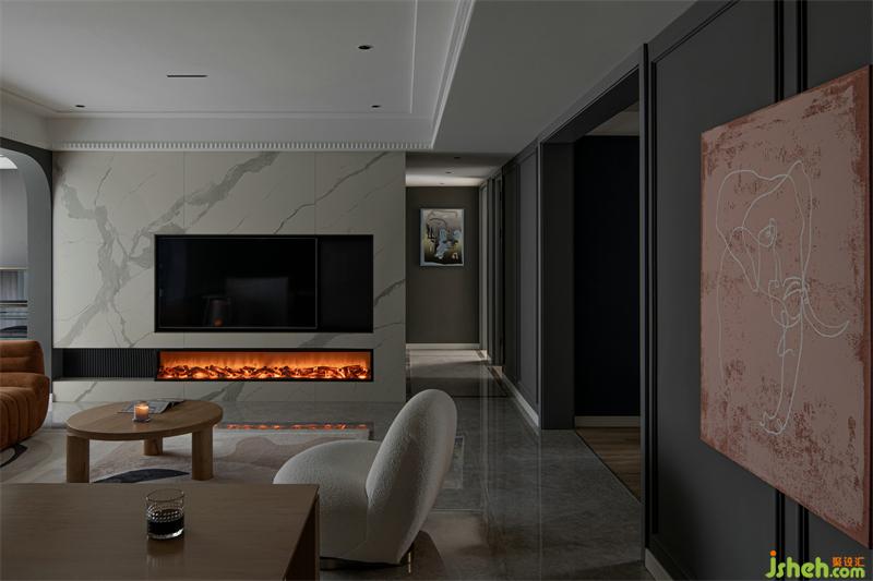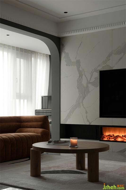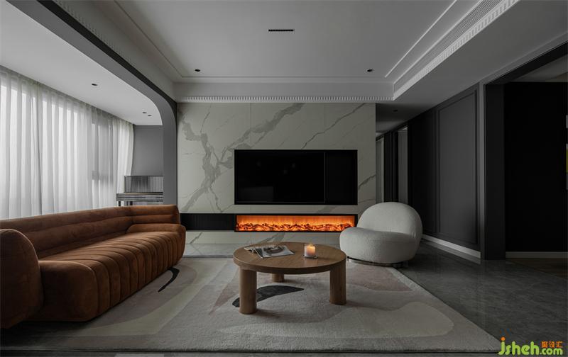 精裝房改造客廳原有頂面拆除,無主燈設(shè)計(jì)增加光源的同時(shí)安裝風(fēng)管機(jī),家具軟裝我們多選用暖色調(diào)打造時(shí)尚空間。巖板電視墻是男主人指定的材質(zhì),巖板質(zhì)感、壁爐為空間增加一絲暖意。