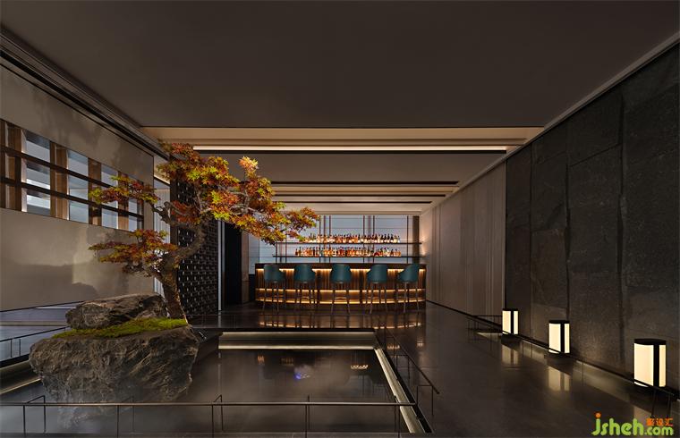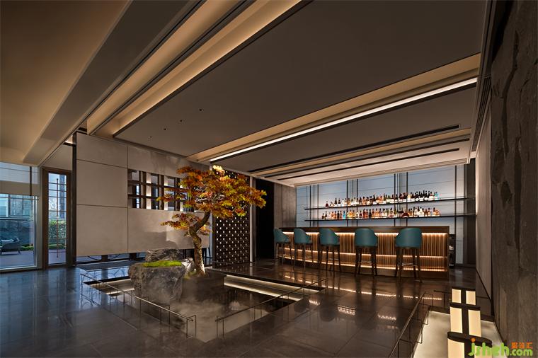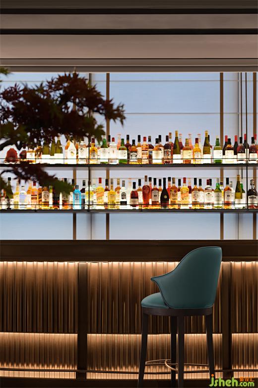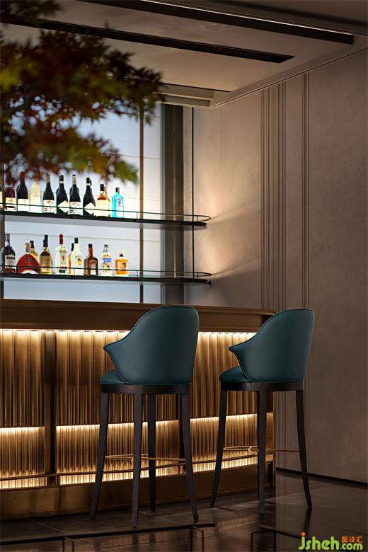 蘊(yùn)五光幽微,著十色陸離。柔光燈帶暗藏于吧臺(tái)內(nèi)緣,光被柜面的起伏花紋蕩起褶皺,細(xì)碎鋪灑在吧臺(tái)表面。設(shè)計(jì)師擅于以明暗劃分層次、用光影渲染意境,錯(cuò)落有致的各色酒品在展示酒柜底部散發(fā)的光暈中蒙絡(luò)一層夢(mèng)幻,光色朦朧,虛實(shí)交映,空庭即是花庭,實(shí)境即是詩(shī)境。