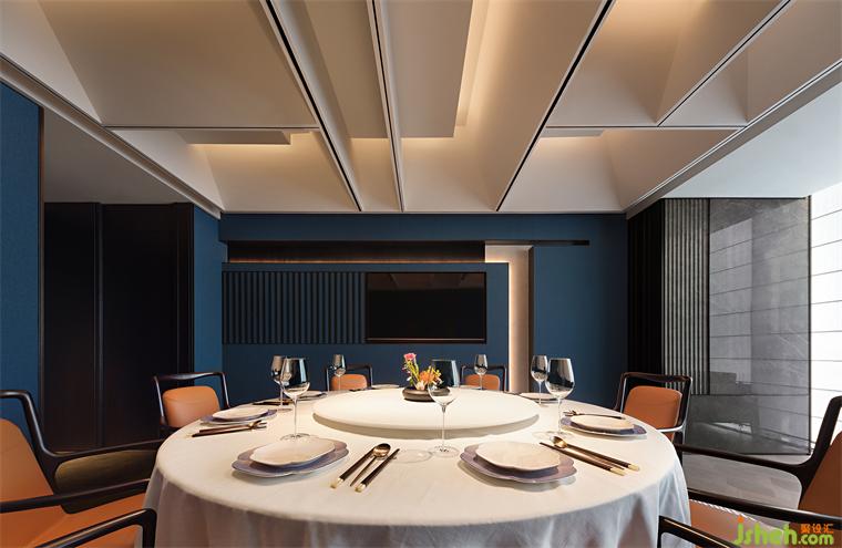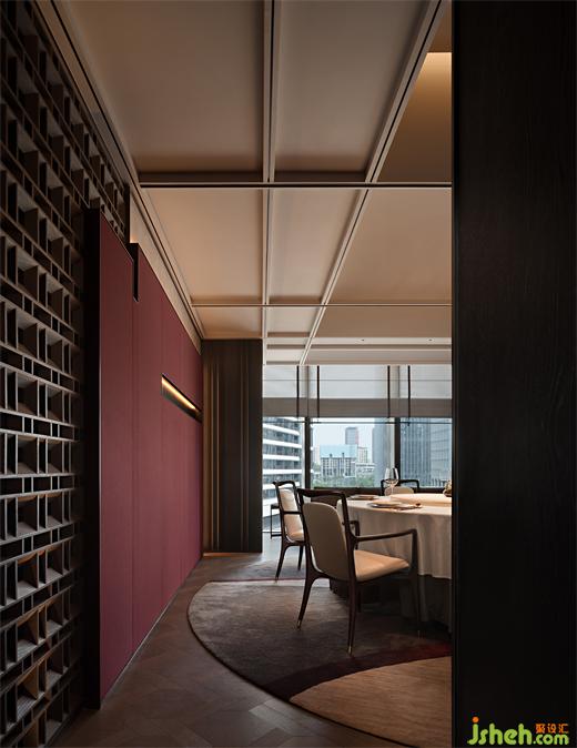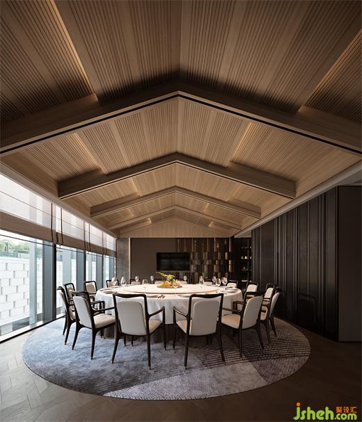 木葉下,江波連,秋月照浦云歇山。云外歡宴,亭下流觴,在親友共慶的時刻,亦有閑情美景為空間點染閑適與寂靜的氛圍。古典窗格隔斷、歇山式天花的運用,即是在石材與木飾面的背景上落一筆精致傳神的點睛之墨,設計師用古雅的藝術筆觸,突破古典與現(xiàn)代的藩籬,餐廳設計以恢弘視角連通不同時代的審美,營造孑然于時光之外的文化雅集。