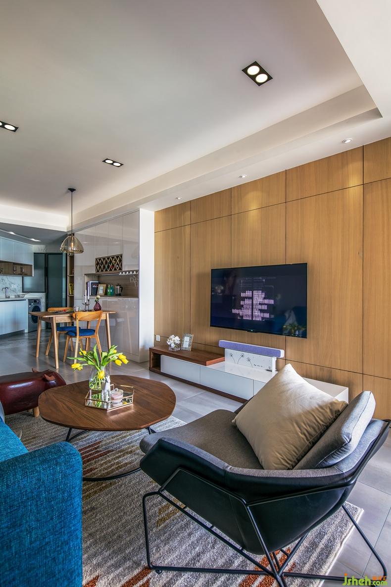 室內(nèi)設計師畫筆一落,整面溫潤的背景墻落入客廳內(nèi),同時隱入了一扇主臥門。隱形設計手法,既解決了門朝廳的問題,又拓寬了客廳的整體視覺效果。