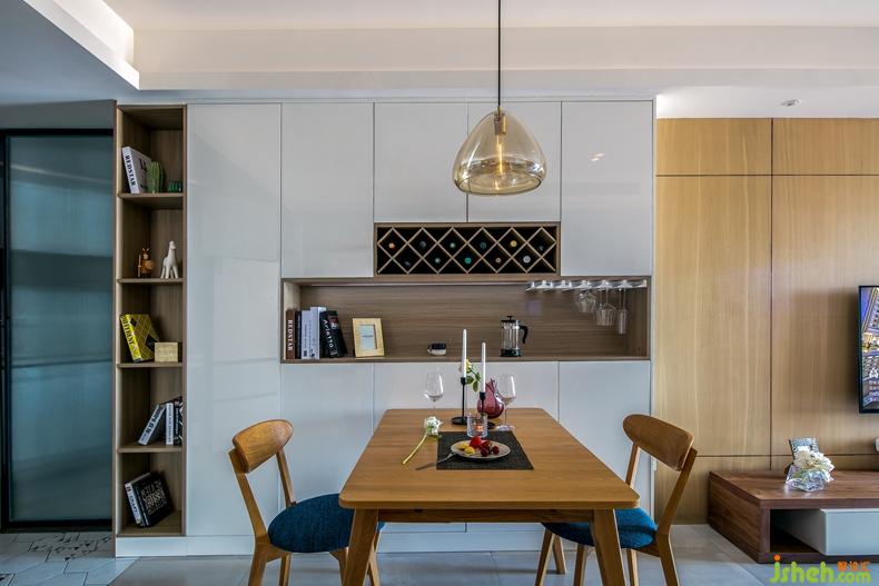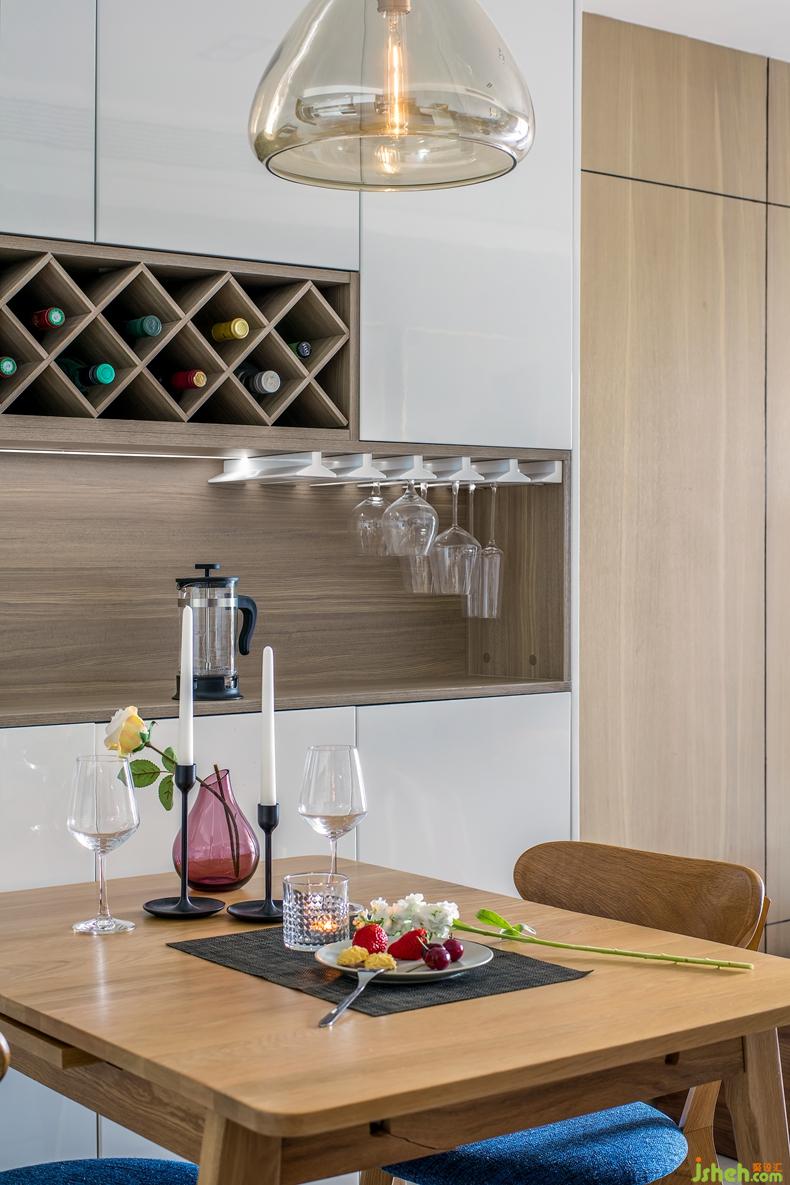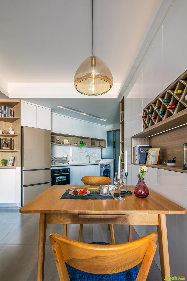 餐廳和廚房是一個家里,最有煙火味兒的地方。設計師以溫潤的原木色、雅致的純白與肌理清晰的木紋灰落定餐廳空間的基調(diào),柔和且大氣。