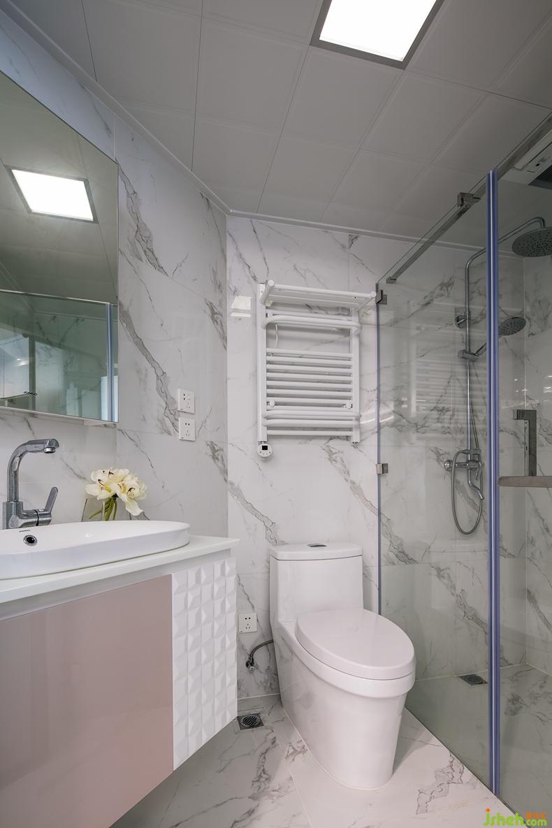 衛(wèi)浴空間位于西廚的內(nèi)側(cè),整體空間采用爵士白大理石貼面,雅致大氣。浴室柜的一抹粉色,很好地柔和了大理石的剛硬。透明玻璃隔斷設(shè)計(jì),完全不會(huì)阻擋視覺空間的延展。室內(nèi)設(shè)計(jì)師