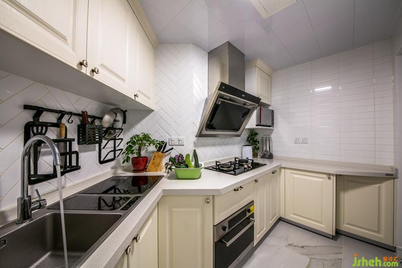 廚房為不規(guī)則空間,狹長狀,設(shè)計(jì)師據(jù)其特性沿墻設(shè)計(jì)不規(guī)則櫥柜,不僅增加了收納與操作空間,連業(yè)主心心念念的大號洗碗機(jī)也毫無壓力地入住廚房。