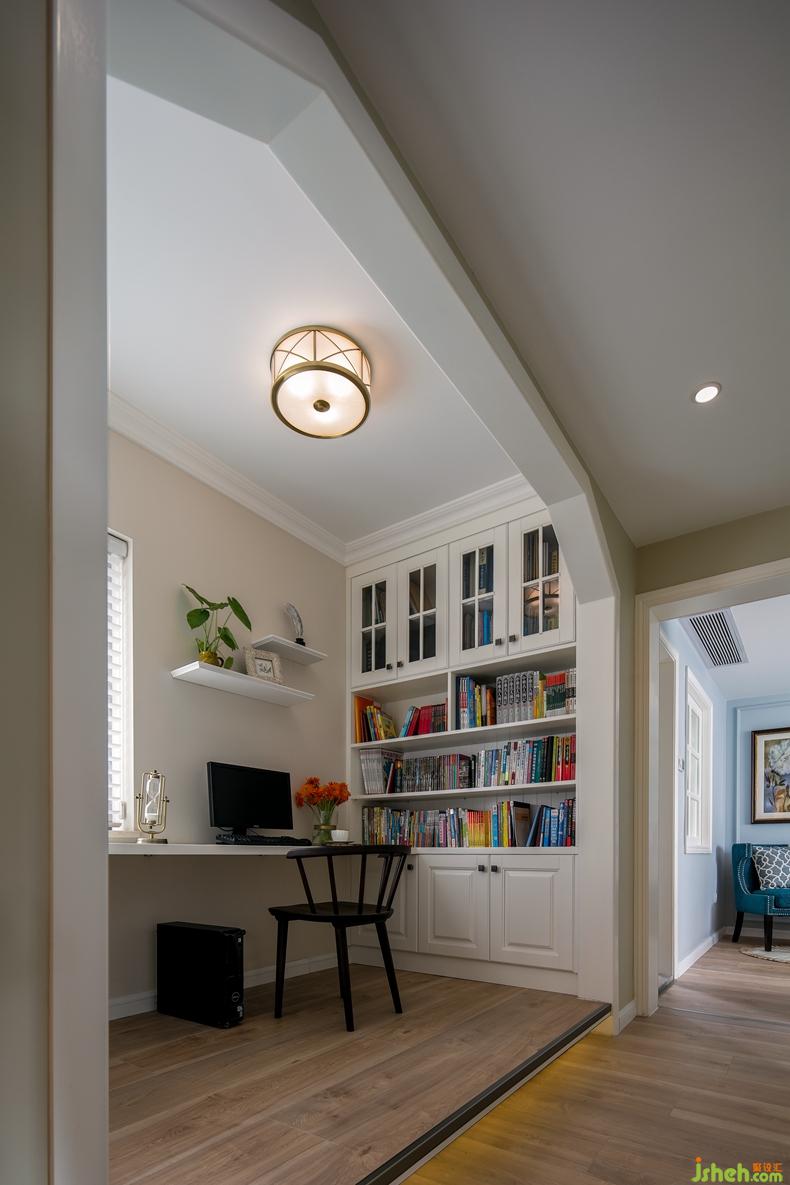 室內(nèi)設(shè)計(jì)師苦心規(guī)劃構(gòu)思,最終在過道一側(cè)設(shè)計(jì)出一個(gè)地臺式的開放型書房,底下設(shè)有一圈燈帶,不僅豐富了空間的功能性,又增添了過道視覺美感。