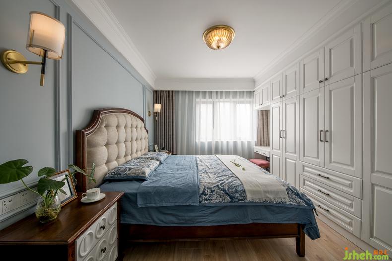 主臥淺藍(lán)色的護(hù)墻板柔軟了空間調(diào)性,細(xì)膩的線條處理手法讓墻面有了舒適的層次感,搭配兩盞微微亮的燈,竟生出一種“一剪閑云一溪月”的居住美感。