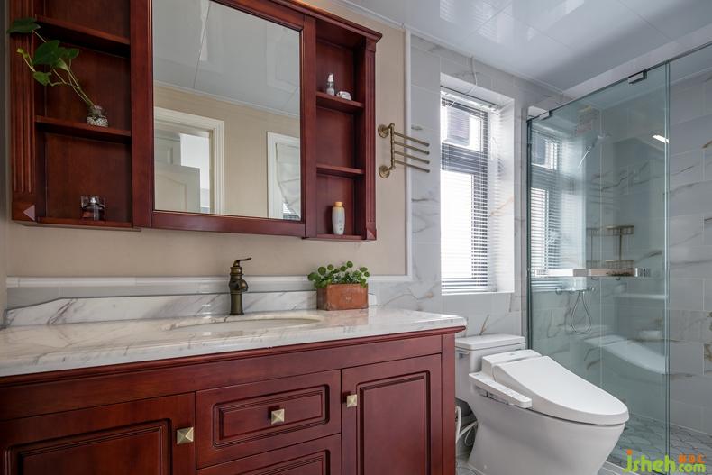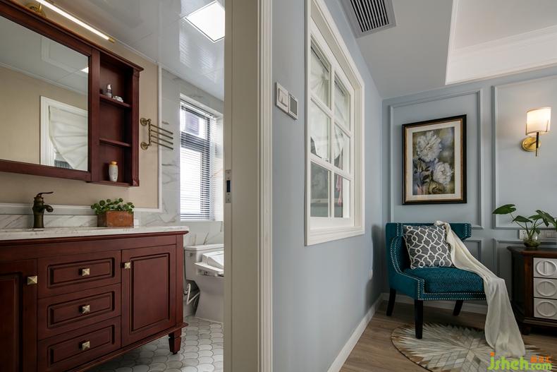 室內(nèi)設(shè)計(jì)師在主臥與主衛(wèi)之間開(kāi)了一扇木窗,增加了空間的通透性與視覺(jué)的延伸感。大理石提升了主衛(wèi)的空間格調(diào),美式的木質(zhì)浴室柜又巧妙勻和了大理石的冰冷感。