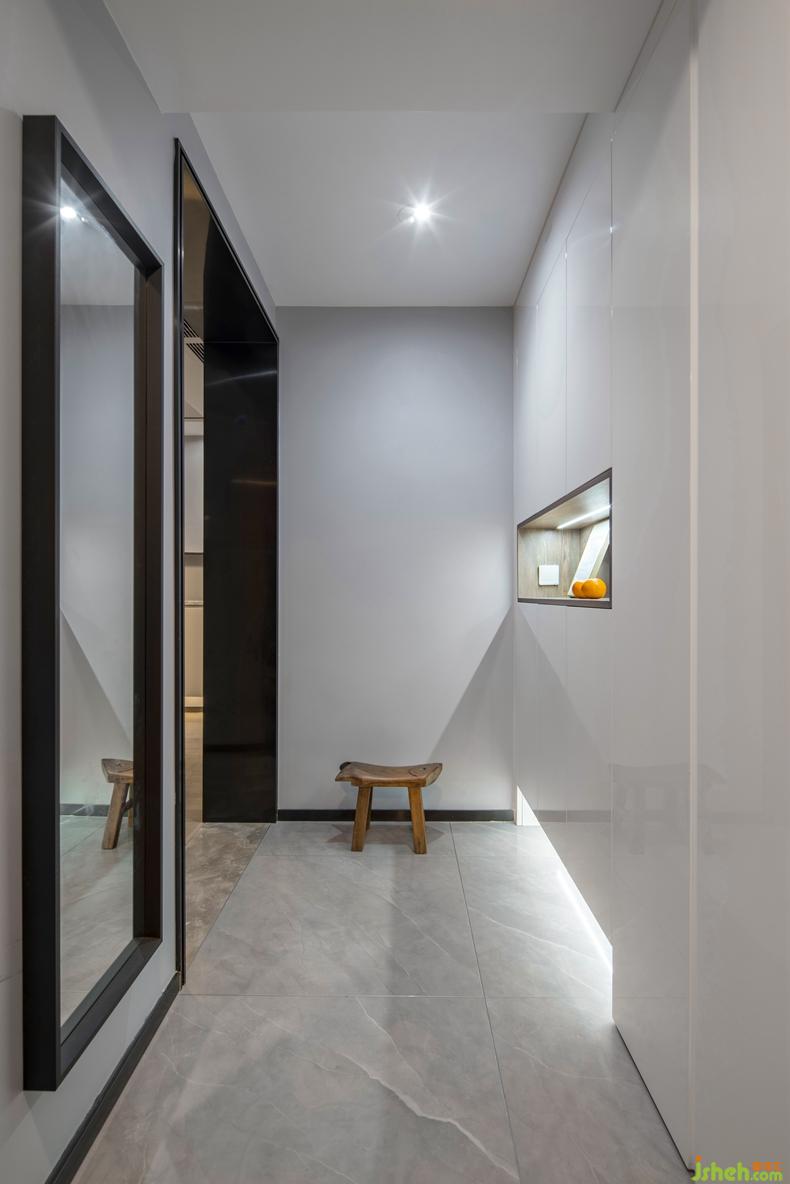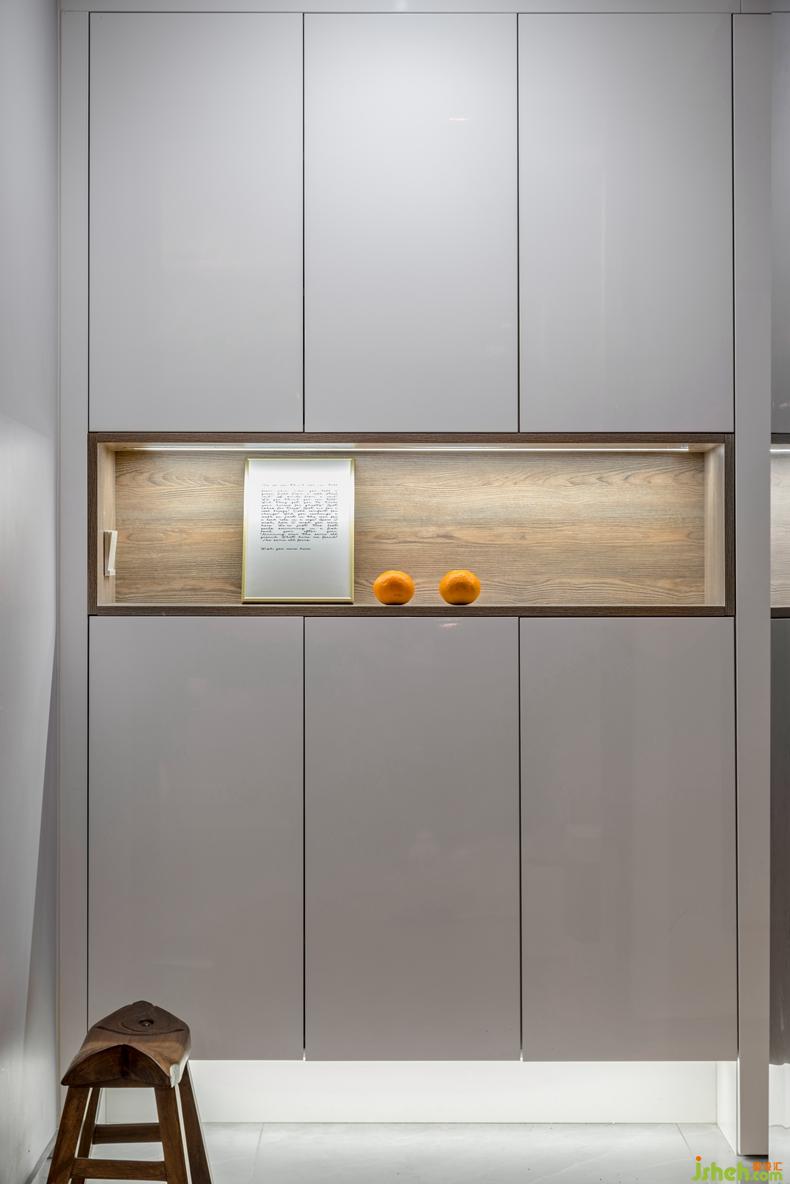 沒有體積龐大的換鞋凳,小巧質(zhì)樸的板凳足以滿足需求。鞋柜中間的設計可以存放鑰匙、包包等小物件,十分方便。人性化的燈光布局,讓照明不再有盲區(qū)。