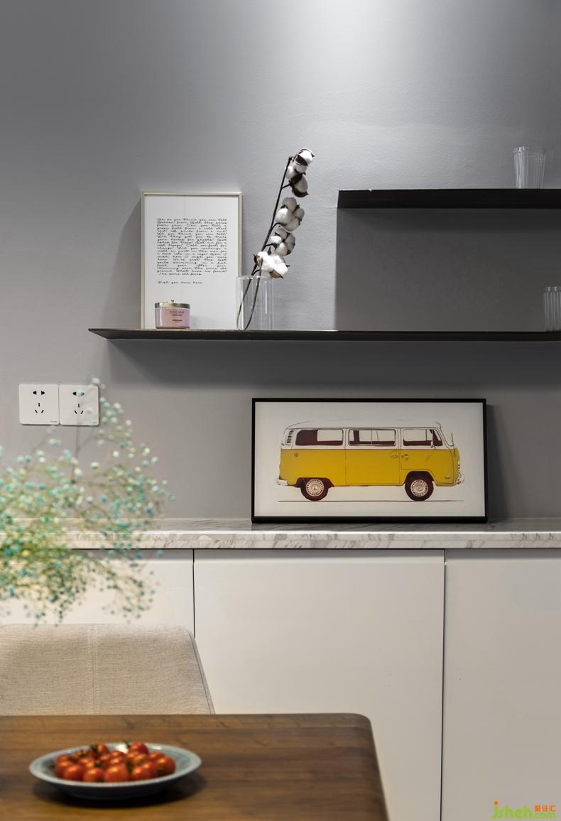 2.敲掉廚房部分墻體,讓餐廚空間更好的互動(dòng)。餐廳打造柜子,與廚房相連部分可充當(dāng)吧臺(tái)功能。