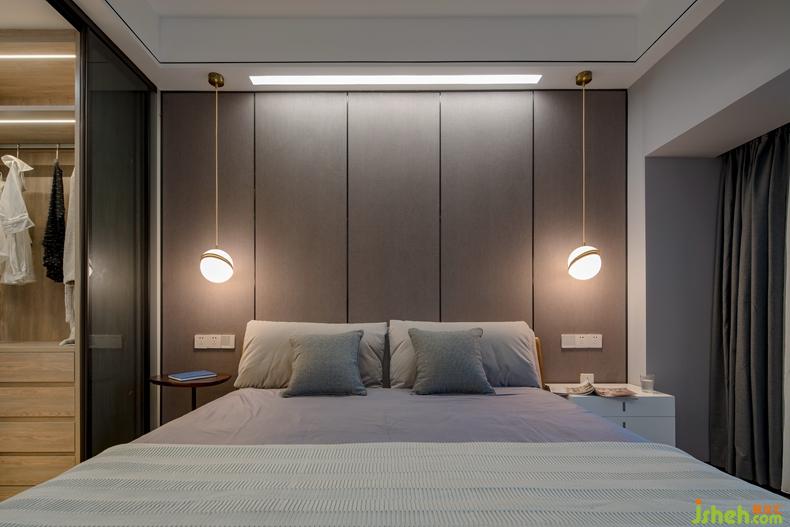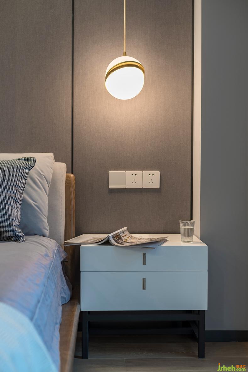 床頭硬包背景墻、吊頂,線條簡(jiǎn)單利落,讓臥室空間令人心安放松。利用洗手間走道打造主臥衣帽間,避免了洗手間正對(duì)床頭的尷尬。選用細(xì)框玻璃門,讓臥室更加開闊。