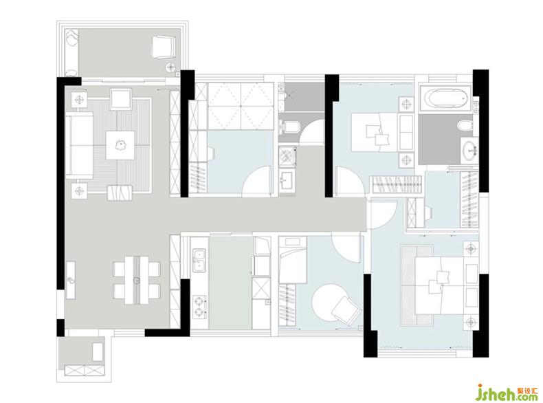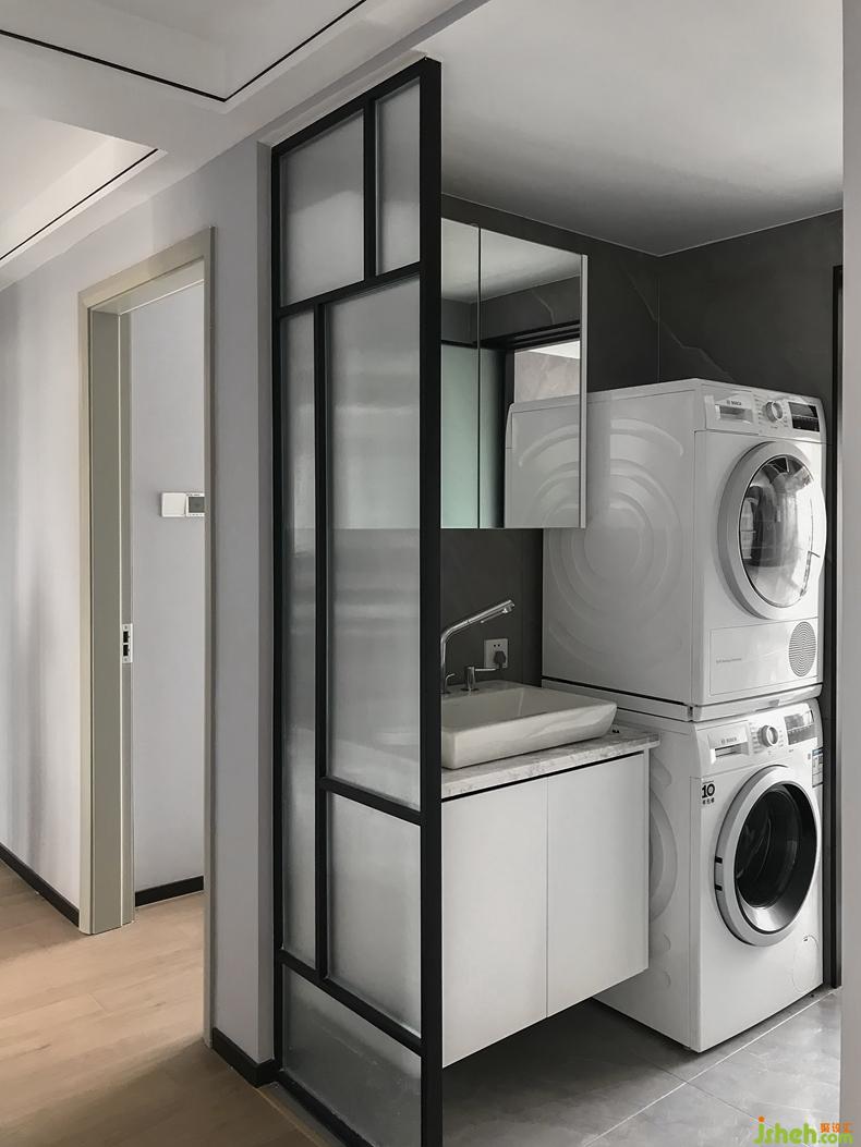 5.公共衛(wèi)生間打造成干濕分區(qū),并將洗衣機(jī)干衣機(jī)放在干區(qū),為陽(yáng)臺(tái)騰出更多空間休閑。