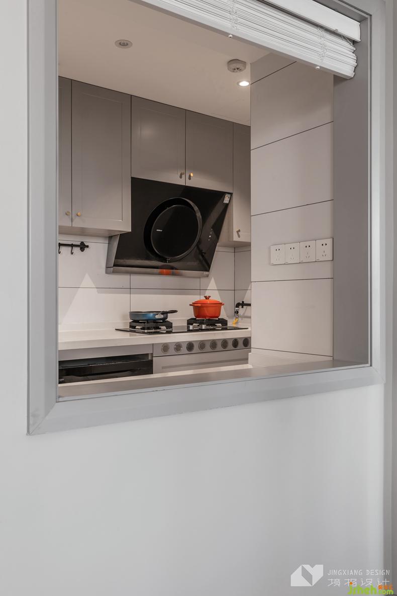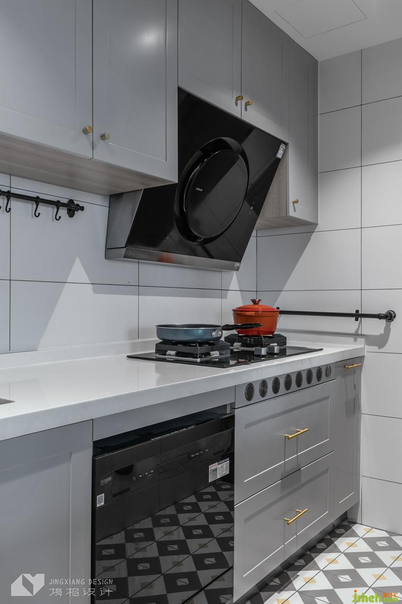 △改造后的廚房面積更大、操作臺(tái)面更充足。白色墻磚、灰色櫥柜,配上地面的花磚,既精致耐看又方便打理。