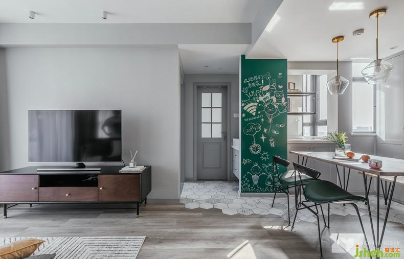 △部分梁體不能改動(dòng),干脆利用梁體打造餐邊柜、高柜,滿足收納需求的同時(shí),消除了拐角。餐廳的一面黑板墻,能讓屋主夫妻在涂鴉之中放松,也為未來的寶寶預(yù)留了涂涂畫畫的空間。