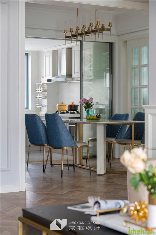 內(nèi)斂而富有質(zhì)感的藍色,配合金屬、大理石材質(zhì),低調(diào)之中質(zhì)感十足,讓吃飯變成一件優(yōu)雅的事情。