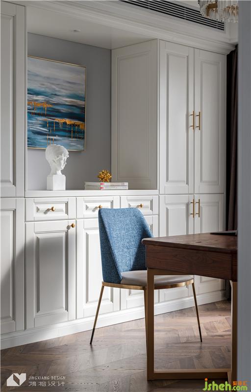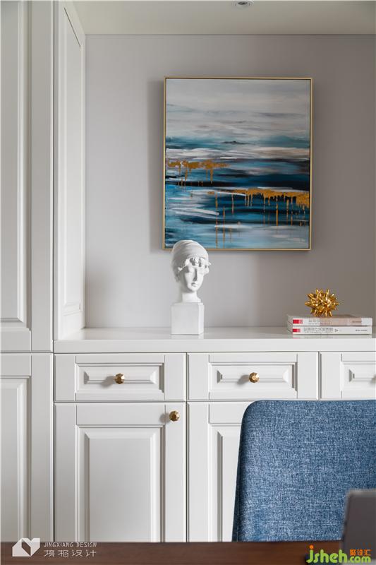 為了避免空間的沉悶感,書柜特意保留了一部分的開放區(qū)域,可以隨手擺放日常所用的小物件。配上裝飾畫、擺件,以及精致的黃銅把手,美觀又具有實用性。室內設計師