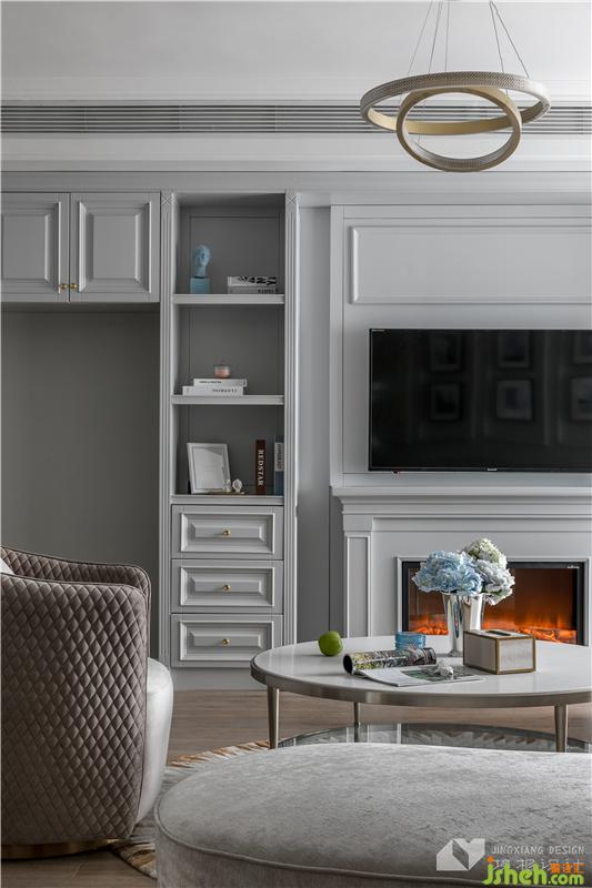 電視背景墻則兼并了顏值與實(shí)用性,多種柜體組合滿足屋主的書籍雜物存放。女屋主十分喜歡壁爐,所以在電視機(jī)下方設(shè)置了仿真壁爐。橫平豎直的石膏線條十分流暢,透出些不凡的氣質(zhì)。
