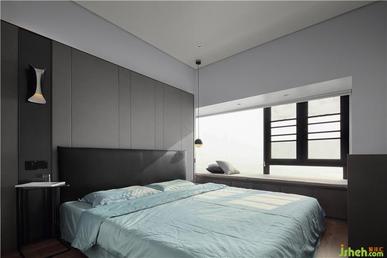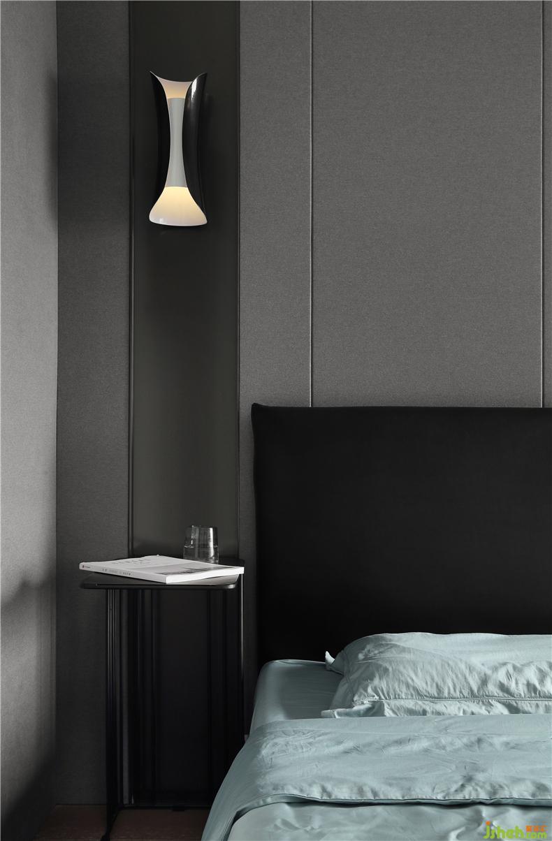 床頭背景墻是硬包混搭啞光鋼板,再與黑色床頭進行混搭,寥寥幾筆便將臥室的硬朗腔調(diào)勾勒出來。